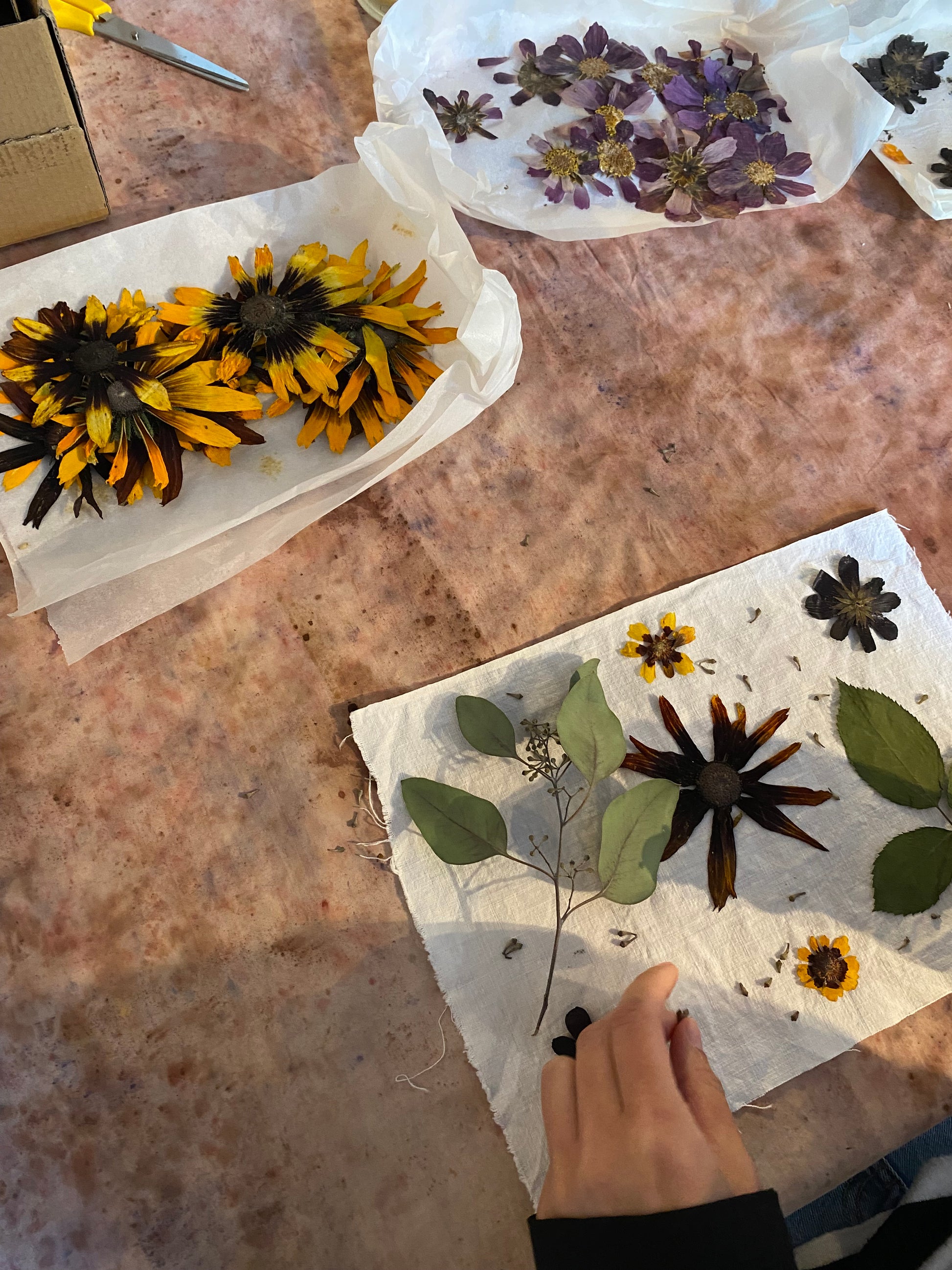 Le bundle dye avec des végétaux en poudre, des fleurs séchées, des feuilles et des pelures.